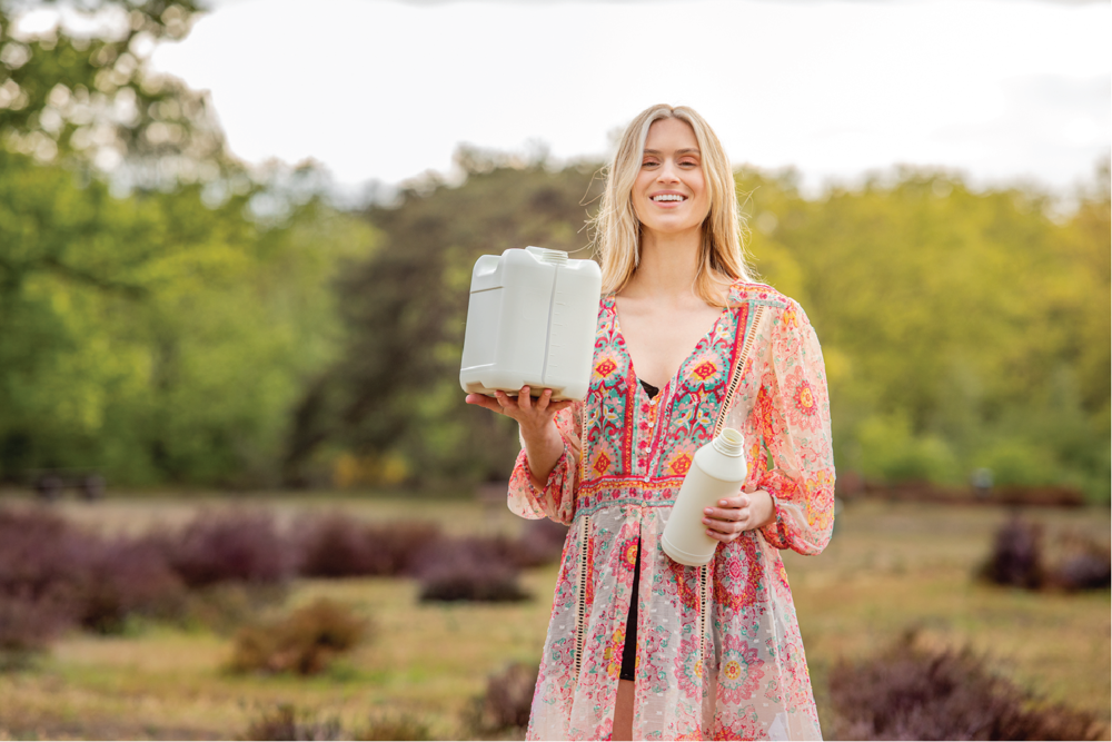 Our 1 liter and 5 liter bottles are made out of 100% PIR materials. PIR is the abbreviation of Post Industrial Recycled. This type of material is composed of leftovers from the production process of plastic containers. The PIR is cleaned and molded to form new bottles.